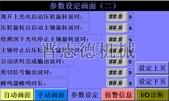 3、“檢測到下光電信號停止主軸旋轉(zhuǎn)延時”, 三合一送料機(jī)材料架部分停止開卷時先停止主軸旋轉(zhuǎn)后停止壓輪旋轉(zhuǎn),該延時設(shè)定檢測到料環(huán)下降到停止主軸旋轉(zhuǎn)的時間。