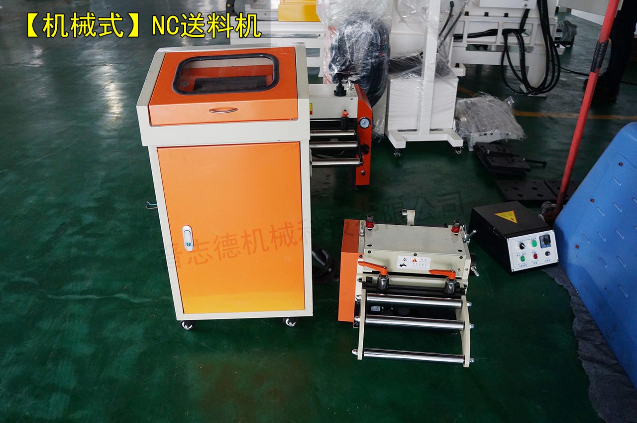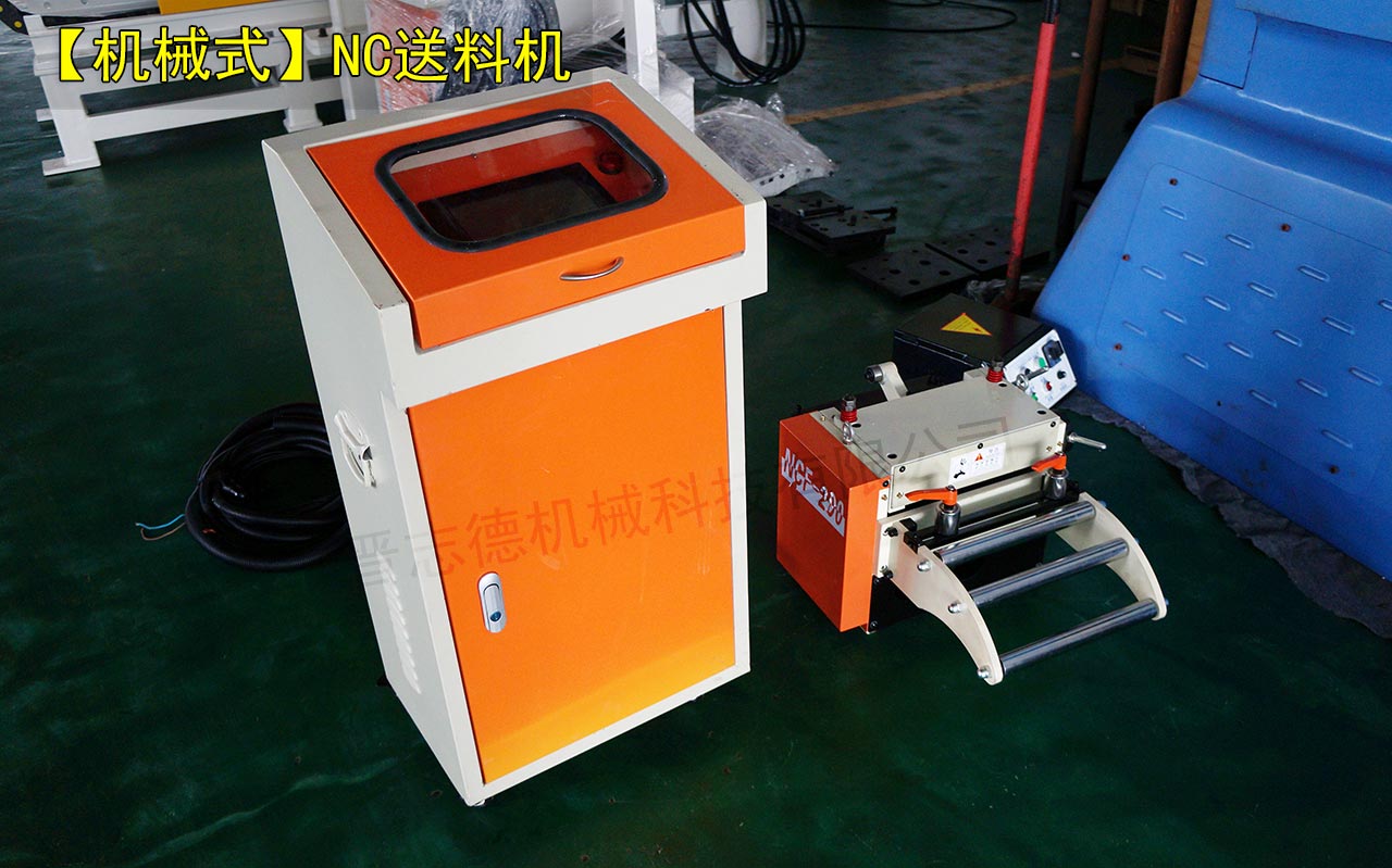 機械式NC送料機是由一杠桿抬臂,其支點設于送料機側壁,一端與上面一組滾輪相連,另一端在送料機頂部形成一抬臂。下壓和上拉抬臂實現滾輪組的壓緊和放松。機械式NC送料機因其需在沖床滑塊上安裝放松支桿,搭配的沖床受局限,但是機械式放松速度快,非常適合短步距高速送料生產,且機械式放松操作更簡便,故障率更低。