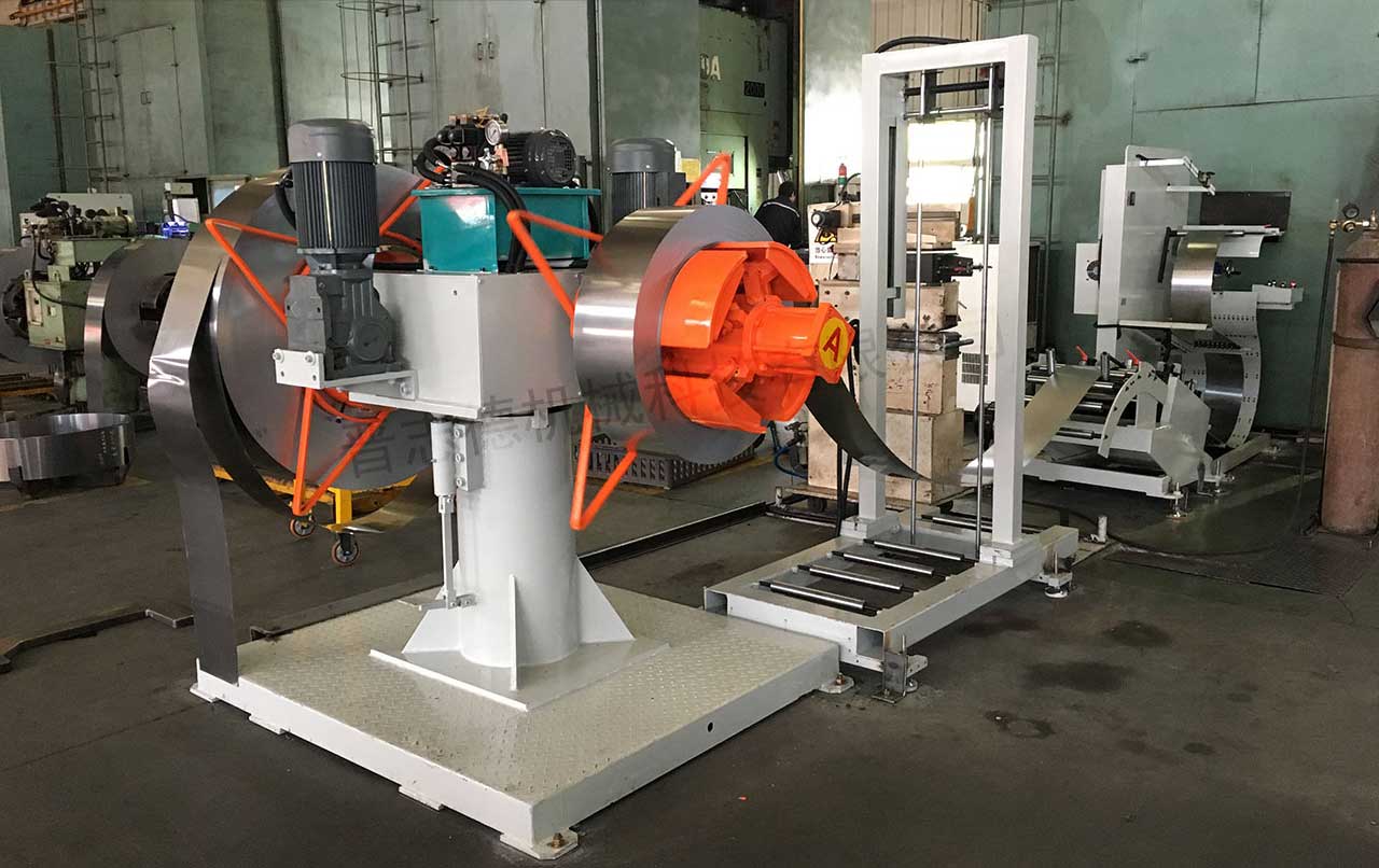 雙頭材料架有兩種款式,一種為無動力型,一種為有動力式,不過兩者結構類似,其都有兩個漲縮卷筒,其間隔為180度,其間通過旋轉軸連接,旋轉軸和兩個漲縮卷筒整體呈“十”字形,旋轉馬達通過驅動旋轉軸旋轉使兩個漲縮卷筒旋轉,可交替進行開卷作業,當一個漲縮卷筒正常開卷時,另一個漲縮卷筒可從容地使用行車或叉車進行上卷,省略了停機裝料時間,從而使得材料在沖壓生產線上能夠連續不斷的行進,提高了流水線的生產效率。