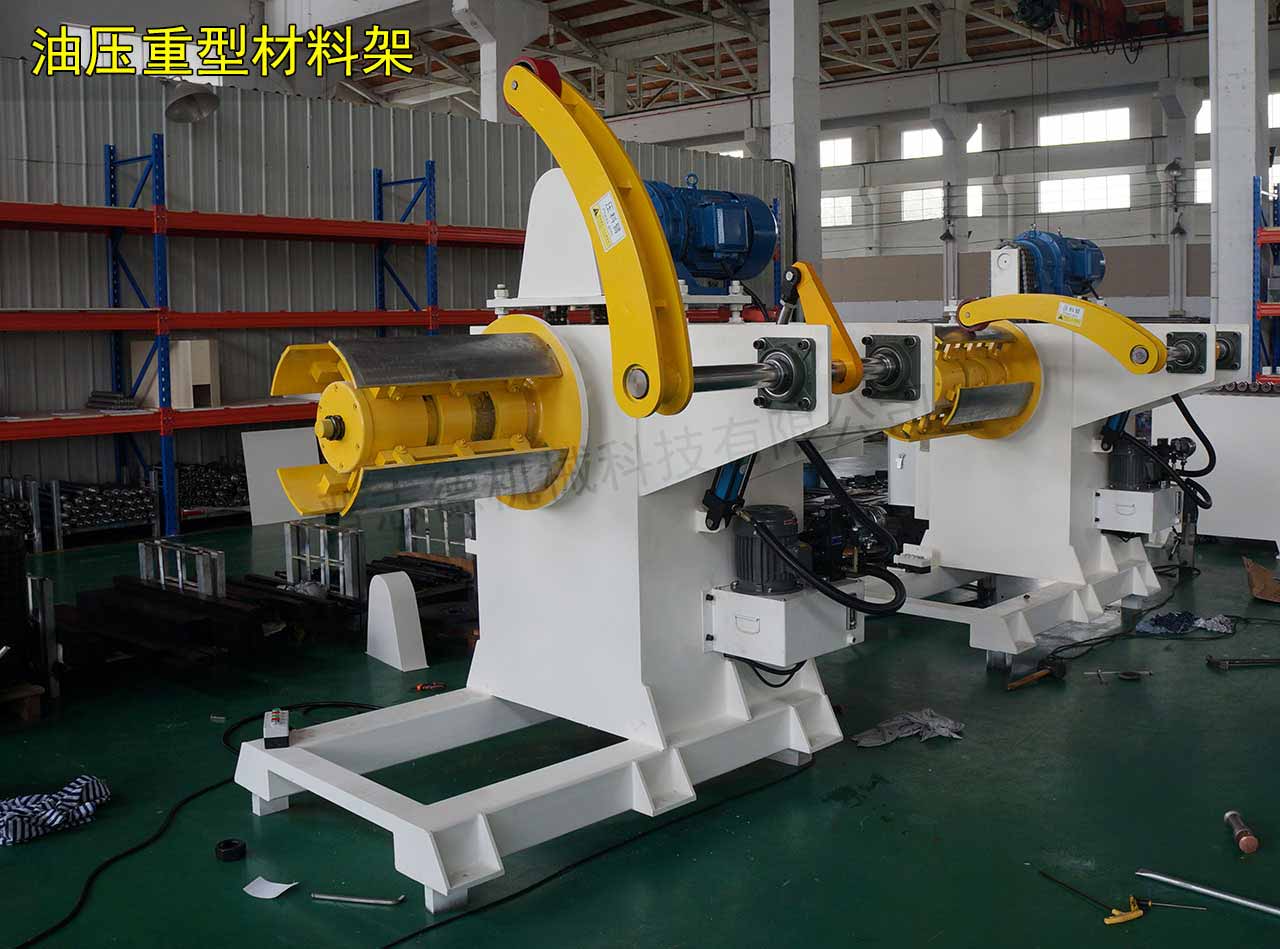 油壓重型材料架是專門針對寬料、重料而研發(fā)制造的機型,其將標(biāo)準(zhǔn)型重型材料架的手搖漲縮方式改為油壓漲縮方式,剎車由普通剎車改為分離式碟剎,同時變頻器、壓料臂的添加,以及主軸、機體的加固,使得油壓重型材料架能夠用于大型寬料、大噸位重料的放料與開卷,目前晉志德油壓重型材料架載重量可訂制20噸,料寬可訂制1800毫米。